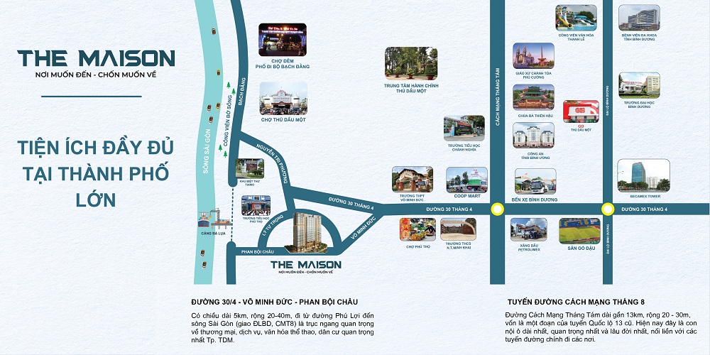 Căn hộ The Maison nằm trung tâm Phường Phú Thọ - một trong những phường lâu đời, sầm uất, và đầy đủ tiện tích của Thành Phố Thủ Dầu Một. Hướng dự án: Dự án nằm ngay khu dân cư đông đúc, tại mặt tiền đường lớn Phan Bội Châu.